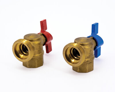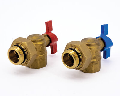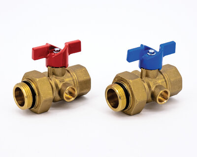 Set of angle ball valves for manifolds. Red and blue butterfly handle.
