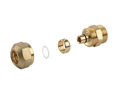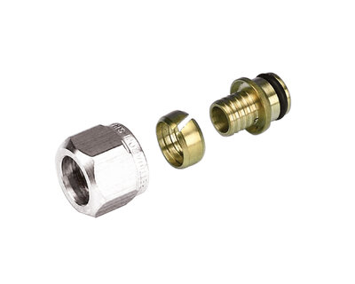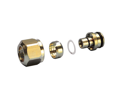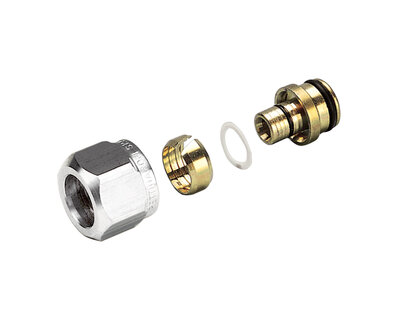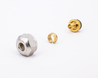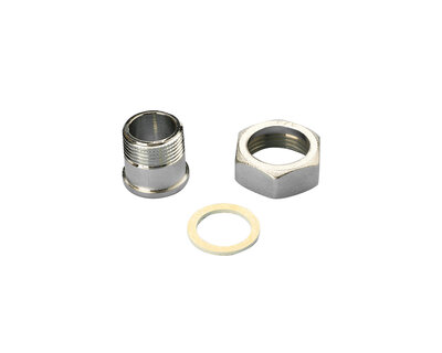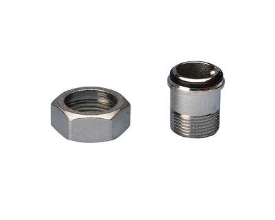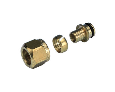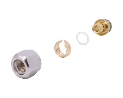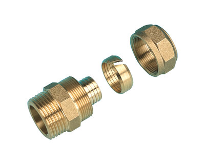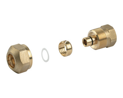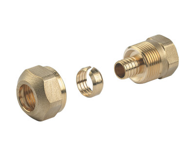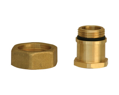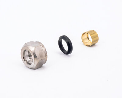 Complete brass adapter fitting for copper and/or mild steel pipe. Nickel-plated
