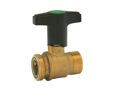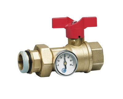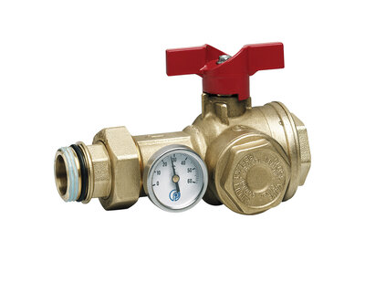 Fullway ball valve with built-in filter (type FM 28), inspectable. With predisposition for thermometer (art. T40/60 not included). Red butterfly…