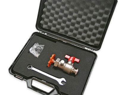 Set of 2 ball valves for manifolds, with seat for thermometer. Red and blue butterfly handle.