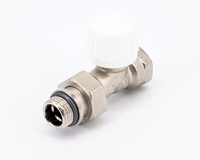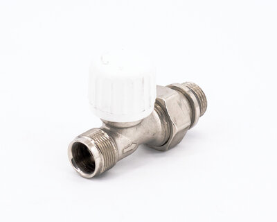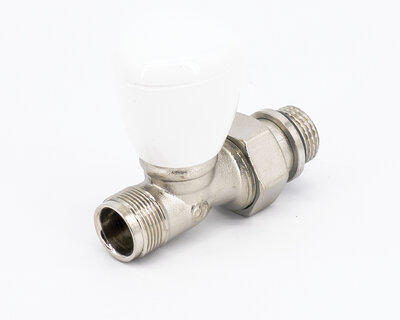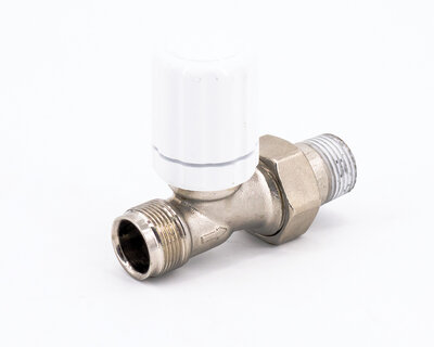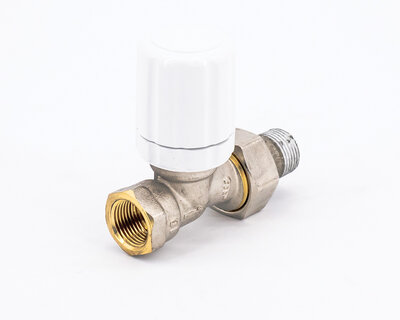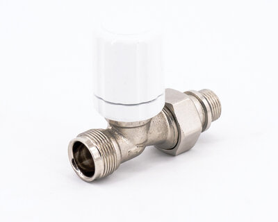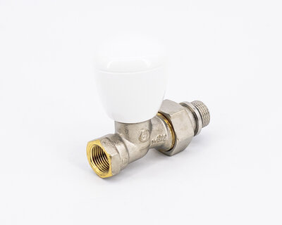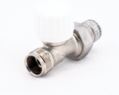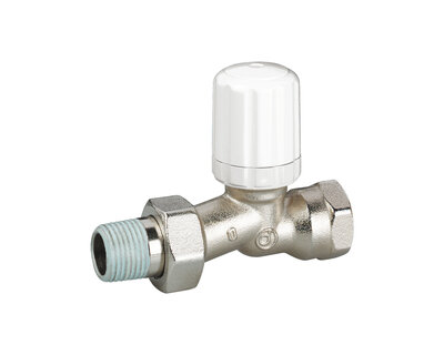 Straight radiator valve, with thermostatic option or thermo-electric control. Female thread. Nickel plated. The valve is not certified to EN 215.