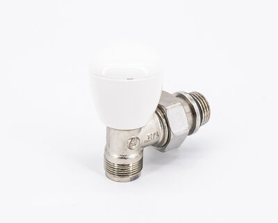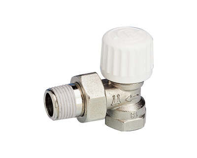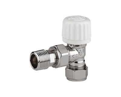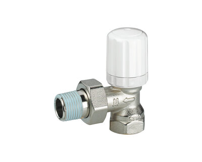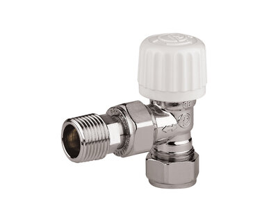 Angle micrometric radiator valve, with thermostatic option or thermo-electric control. Female thread. Nickel plated. Conform to EN215.