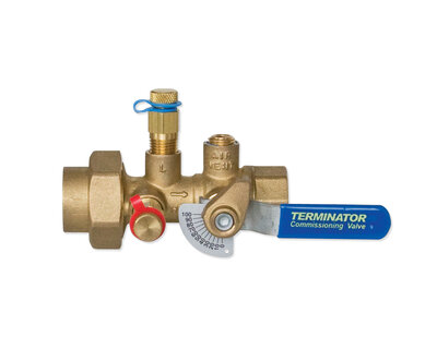 Terminator balancing valve with memory stop, venturi for flow rate measuring and patented linear low profile ball. DN15.