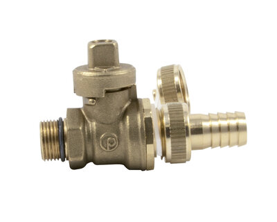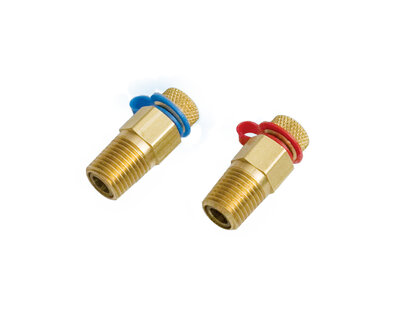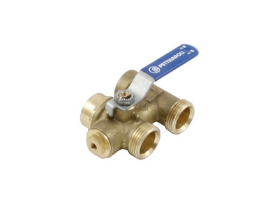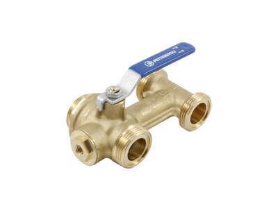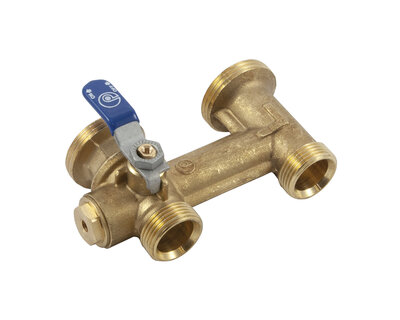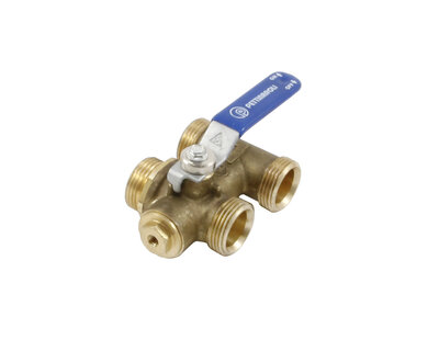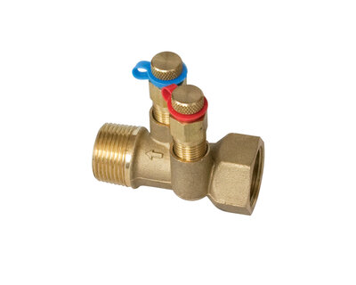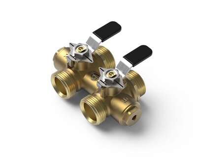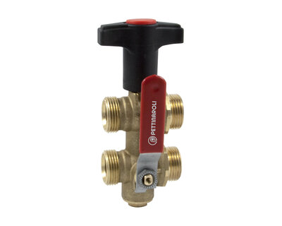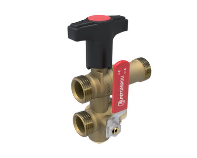 Compact manifold with integrated ball valve and red handle.